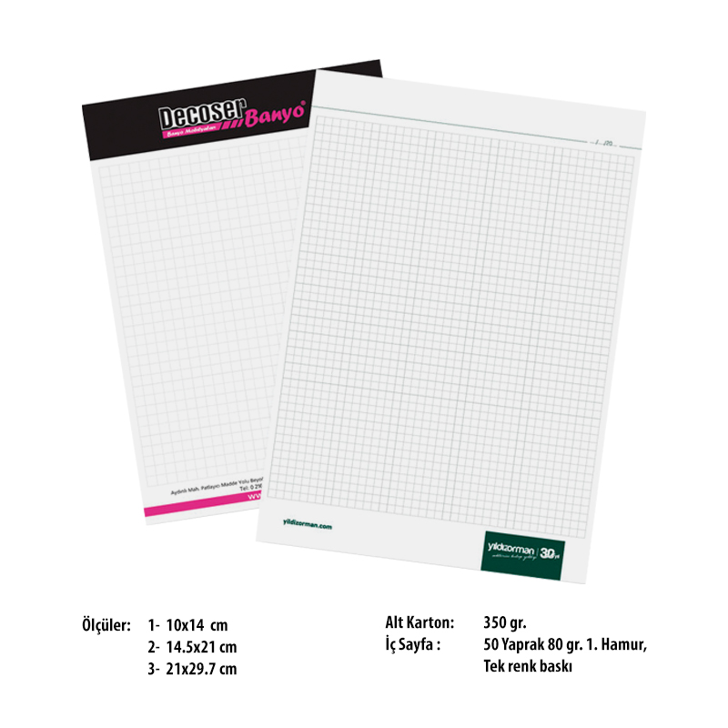 Dijital Baskı Ölçü: 105 x 140 mm, 145 x 210 mm, 210 x 297 mm İç Sayfa: 50 Yaprak 80 gr. 1. Hamur, 1 renk baskı Alt Karton: 350 gr.