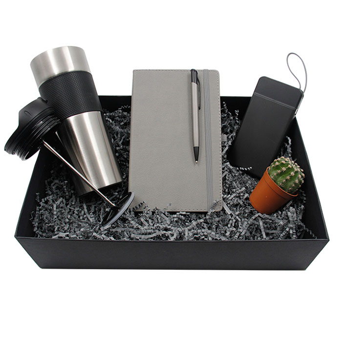Paslanmaz çelik french pressli termosTemro deri defter, Metal kalemUV baskıya uygun powerbank 10.000 mAhDefter ölçü: 13 x 21 cmKutu ölçüsü: 34,5 x 23 cm