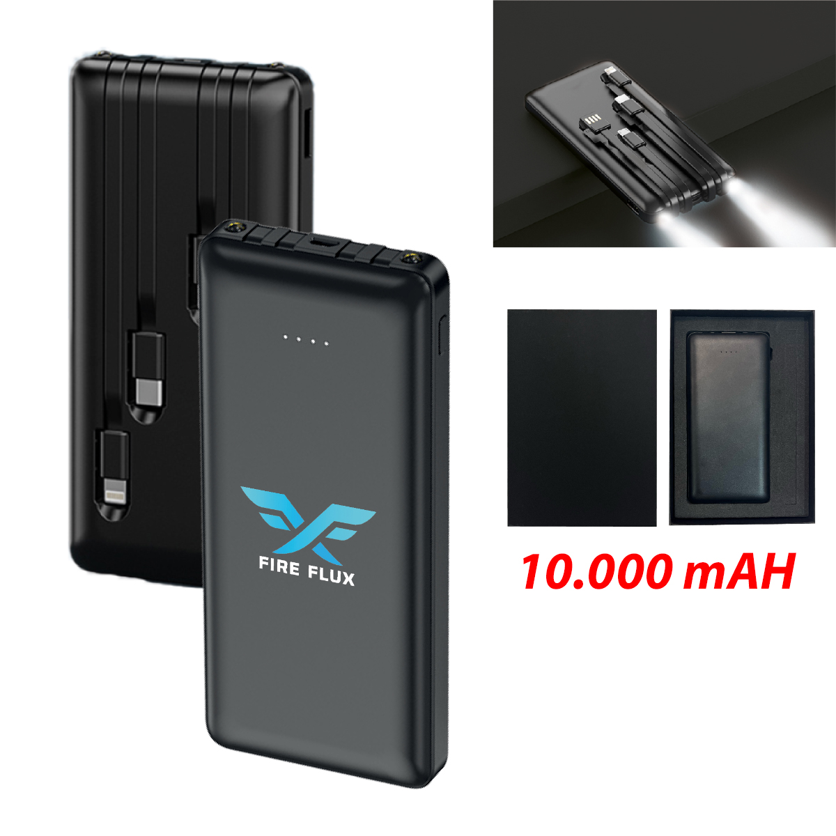 Built-USB input cabble: 5V/2.4AUSB output: 5V/2Atype C OUTPUT: 5V/2AMicro cable: 5V/2Alightning outpu: 5V/2.1A10.000 mAhSiyah karton kutuludur.